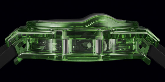 The Big Bang MP-11 in green Saxem is manually wound via the large fluted crown featuring embossed wormscrew-like ridges reminiscent of the helical gear, or with the help of a Torx-stamped electric pen inspired by motor racing. It comes with a black rubber strap whose oblique lines echo the crown design. This gem of technicality and transparency is produced in a limited run of 20 pieces.