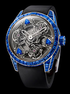 This unique 47mm creation made of white gold displays striking staging. Its complex mechanism is magnificently highlighted by the 233 invisible-set royal blue sapphires, including three solitary trillion sapphires floating on the dial. The three tourbillons, which spin on their axis in 60 seconds, are scattered across a rotating plate that performs six turns per hour. They are powered by the energy of the double barrel supplied by an ingenious differential.
