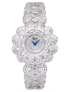 This one-of-a-kind creation belonging to the Red Carpet Collection is entirely crafted in ethical white gold. It is a splendidly seductive and opulent model free of any hour-markers and graced with slender hands that appear to vanish beneath this floral beauty. Playing with different stone cuts, it features enchanting alternations between heart, half-moon, brilliant and trapeze-like shapes. This bewitchingly curved creation showcases around 43 carats and celebrates the sacred nature of time by crowning it with a luminous diadem.