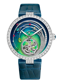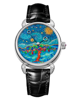 The shimmering colours of this white gold creation are exquisite. Two radically different techniques unite to adorn the dial with a majestic scene. The star-studded sky above the vineyard has been created using an ancestral Japanese technique meticulously mingling Kinpun (gold dust), Jyunkin-itakane (gold leaf), Yakou-gai (green shell) and Awabi-gai (abalone shell from New Zealand). The flamboyant shades of the vinestock are crafted in cloisonné enamel.