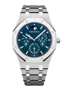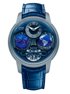This self-winding watch is the world’s thinnest in its category. Its case combines titanium and platinum to achieve elegance and lightness. The polished and satin-brushed surfaces adorning it accentuate the delightful contrast between the two materials. Its dial features a blue satin finish designed to enhance legibility. In addition to the hours and minutes, this impressive technical feat provides perpetual calendar indications of the date, day, month and leap-year cycle, as well as a day/night indication and moon phases.