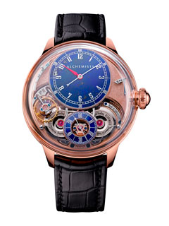 Alchemists Mechanical Healing is introducing this watch, first chapter in a trilogy, largely composed of Cuprum 479, a new alloy containing copper, silver and gold. This material boasts amazing stability in terms of its ability to avoid oxidation. In order to enable copper to exercise its beneficial effects when in contact with the skin, the architecture of the calibre has been reversed, thereby offering a unique sight during the winding process. The “atmosphere” sapphire crystal encapsulates the calibre and further enhances the enchantment of the movement.