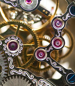 A mechanical movement contains watchmaker’s stones that reduce friction, and hence wear, to a minimum. The rubies that were originally used have long since been replaced by synthetic sapphires. These jewels, as they are still called, are turned, polished and drilled to serve as bearings for the different gears of a watch.